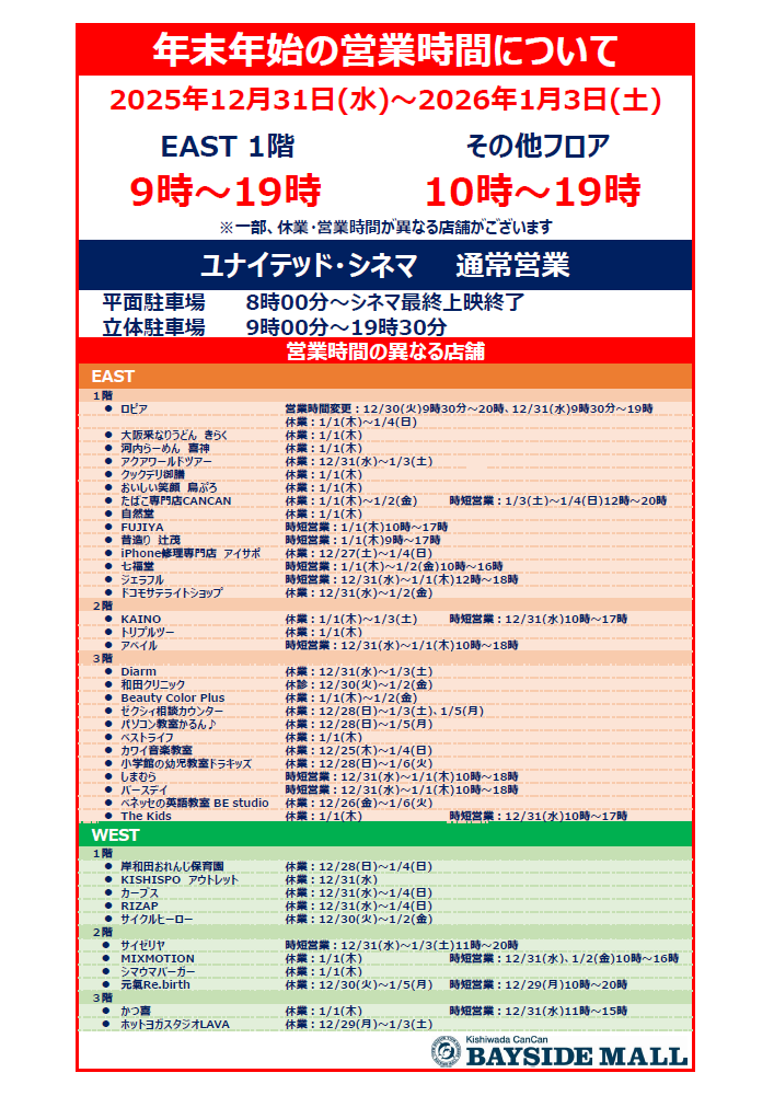 年末年始休業・営業時間短縮店舗のお知らせ